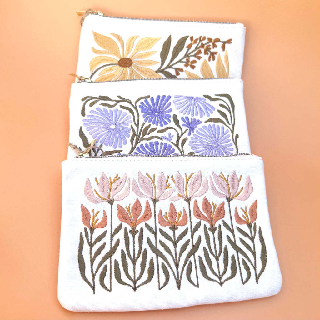 Keep small things handy, organized and secure with this gorgeous embroidered pouch. Printed canvas pouch with lining and gold metal zipper pull.