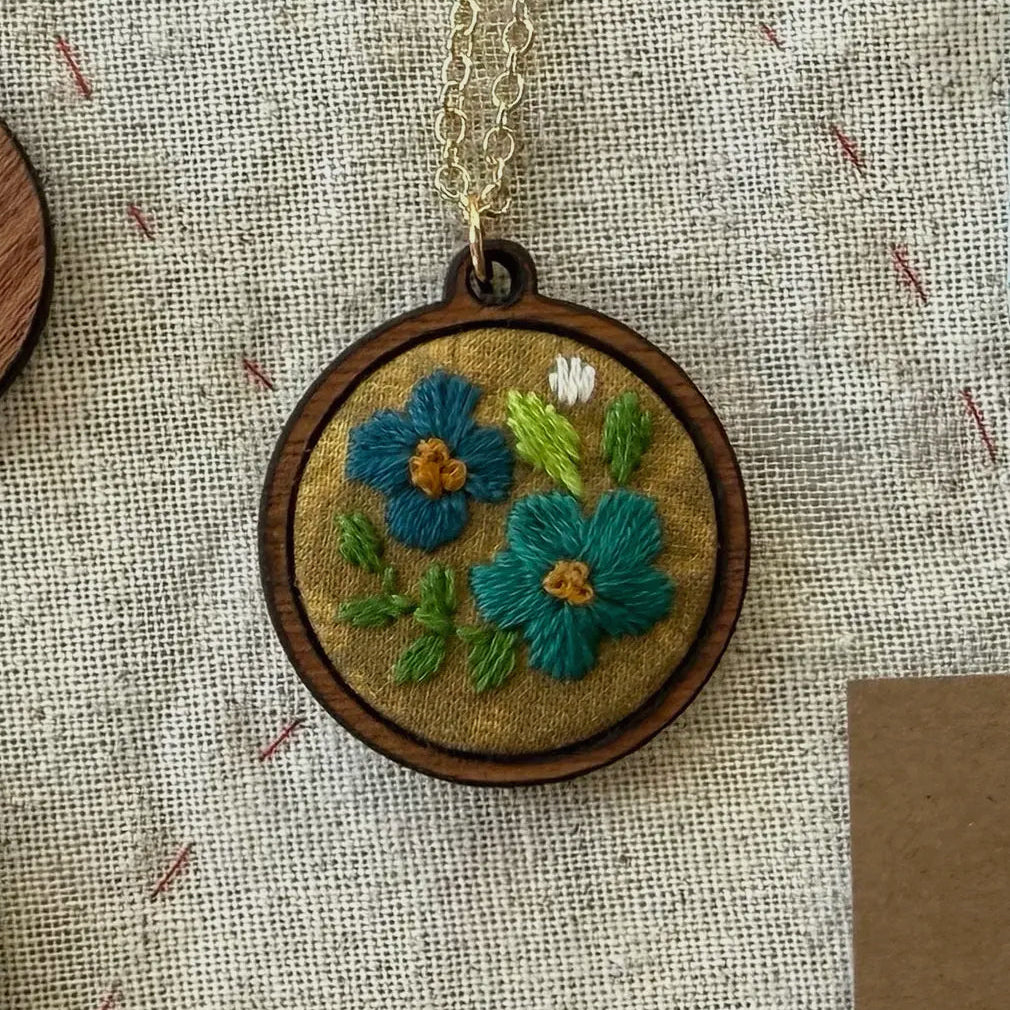 Rikrack Embroidery Flowers Necklace Kit comes with everything you need to make this beautiful and unique necklace. Perfect project for beginners and beyond. Your kit comes with: 6 inch hoop, fabric, needle, stick and stitch water soluble design, two piece 1.5 inch wood charm, 24" necklace chain, instruction sheet, floss.